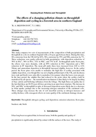 Skeffington, R. and Hill, T. (2012) The effects of a changing pollution climate on throughfall deposition and cycling in a forested area in southern England. Science of the Total Environment, 434. pp. 28-38. ISSN 0048-9697 doi: 10.1016/j.scitotenv.2011.12.038