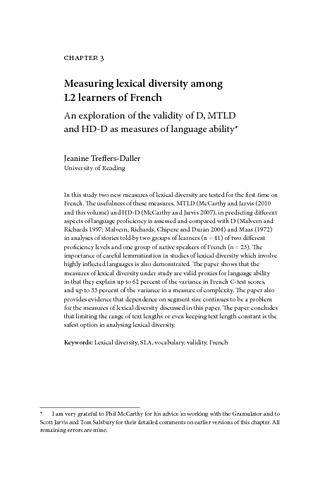 • Tidball, F. and J. Treffers-Daller (2007). Exploring measures of vocabulary richness in semi-spontaneous speech of native and non-native speakers of French: a quest for the Holy Grail? In: Daller, H., Milton, J. and Treffers-Daller, J. (eds.) Modelling and assessing vocabulary knowledge (pp.133-149). Cambridge: CUP.