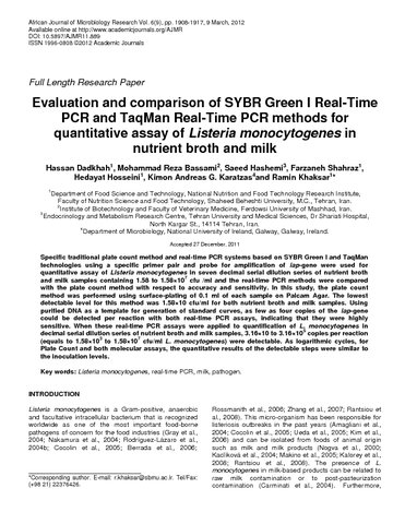 Evaluation and comparison of SYBR Green I Real-Time PCR and TaqMan Real-Time PCR methods for quantitative assay of Listeria monocytogenes in nutrient broth and milk
