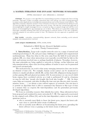 Grindrod, P. and Higham, D. J. (2012) A matrix iteration for dynamic network summaries. SIAM Review, 55 (1). pp. 118-128. ISSN 1095-7200 doi: 10.1137/110855715