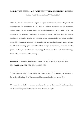 Casu, B., Ferrari, A. and Zhao, T. (2013) Regulatory reform and productivity change in Indian banking. Review of Economics and Statistics, 95 (3). pp. 1066-1077. ISSN 1530-9142 doi: 10.1162/REST_a_00298