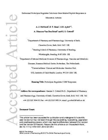 McNeish, A., Roux, B. T., Aylett, S.-B., Van Den Brink, A. M. and Cottrell, G. S. orcid id iconORCID: https://orcid.org/0000-0001-9098-7627 (2012) Endosomal proteolysis regulates calcitonin gene-related peptide responses in mesenteric arteries. British Journal of Pharmacology, 167 (8). pp. 1679-1690. ISSN 1476-5381 doi: 10.1111/j.1476-5381.2012.02129.x