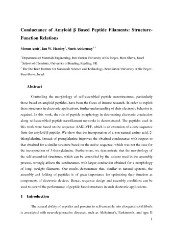 Conductance of amyloid β based peptide filaments: structure–function relations.