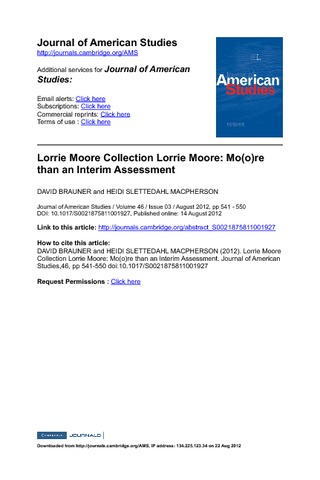 Lorrie Moore has long shed the image of the precocious talent who won the Seventeen story prize with her first submission as a nineteen-year-old undergraduate, but there is still a sense that her best work may be yet to come. In that respect, this mini special issue represents by no means the final word on Moore, but rather an interim assessment of a career that is already substantial and that promises much more to come. Together these three essays (and introduction) offer a coherent and striking exploration of Moore's work that develops new directions for future criticism and will help cement her growing reputation as one of the most original and distinctive contemporary writers. They sometimes circle around the same stories, even the same quotations, reading them in a variety of frames and picking up (and at) the nuances of Moore's sustained wordplay and careful documenting of space, of identity, of gender. Thus these essays work together rather than separately, layering over multiple understandings of Moore's incisive American literature.