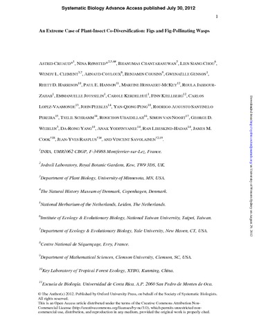 Cruaud, A., Ronsted, N., Chantarasuwan, B., Chou, L. S., Clement, W. L., Couloux, A., Cousins, B., Genson, G., Harrison, R. D., Hanson, P. E., Hossaert-Mckey, M., Jabbour-zahab, R., Jousselin, E., Kerdelhue, C., Kjellberg, F., Lopez-Vaamonde, C., Peebles, J., Peng, Y.-Q., Pereira, R. A. S., Schramm, T., Ubaidillah, R., Noort, S. V., Weiblen, G. D., Yang, D.-R., Yodpinyanee, A., Libeskind-Hadas, R., Cook, J. M., Rasplus, J.-Y. and Savolainen, V. (2012) An extreme case of plant-insect co-diversification: figs and fig-pollinating wasps. Systematic Biology, 61 (6). pp. 1029-1047. ISSN 1063-5157 doi: 10.1093/sysbio/sys068