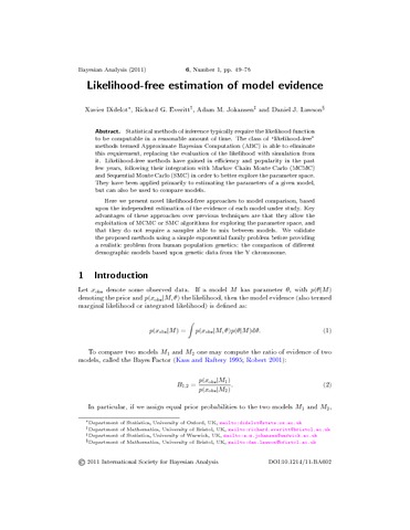 Didelot, X., Everitt, R. G., Johansen, A. M. and Lawson, D. J. (2011) Likelihood-free estimation of model evidence. Bayesian Analysis, 6 (1). pp. 49-76. ISSN 1931-6690 doi: 10.1214/11-BA602