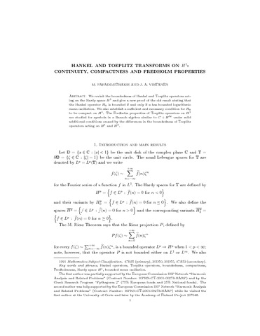 Papadimitrakis, M. and Virtanen, J. A. (2008) Hankel and Toeplitz transforms on H 1: continuity, compactness and Fredholm properties. Integral Equations and Operator Theory, 61 (4). pp. 573-591. ISSN 0378-620X doi: 10.1007/s00020-008-1609-2