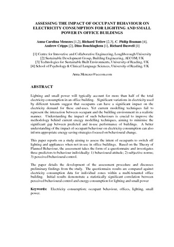 Menzes, A. C., Tetlow, R., Beaman, C. P. orcid id iconORCID: https://orcid.org/0000-0001-5124-242X, Cripps, A., Bouchlaghem, D. and Buswell, R. (2012) Assessing the impact of occupant behaviour on the electricity consumption for lighting and small power in office buildings. In: 7th International Conference on Innovation in Architecture, Engineering & Construction, 15-17th Aug 2012, Sao Paolo, Brazil.