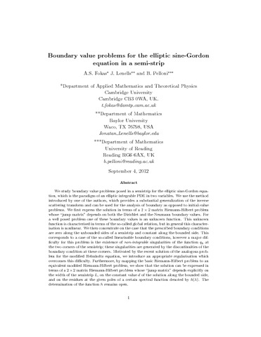 Fokas, A. S., Lenells, J. and Pelloni, B. (2013) Boundary value problems for the elliptic sine-Gordon equation in a semi-strip. Journal of Nonlinear Science, 23 (2). pp. 241-282. ISSN 2008-1901 doi: 10.1007/s00332-012-9150-5