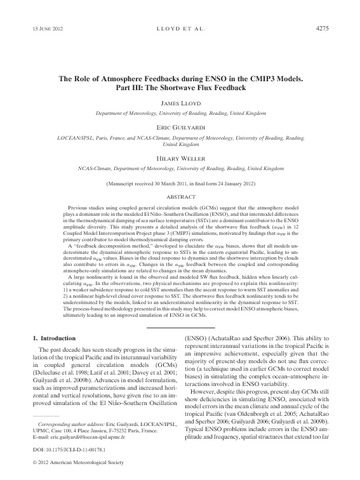 Lloyd, J., Guilyardi, E. orcid id iconORCID: https://orcid.org/0000-0002-2255-8625 and Weller, H. orcid id iconORCID: https://orcid.org/0000-0003-4553-7082 (2012) The role of atmosphere feedbacks during ENSO in the CMIP3 models. Part III: the shortwave flux feedback. Journal of Climate, 25 (12). pp. 4275-4293. ISSN 1520-0442 doi: 10.1175/JCLI-D-11-00178.1