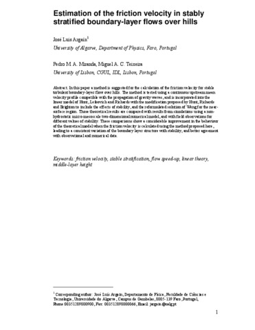 Estimation of the friction velocity in stably stratified boundary-layer flows over hills.