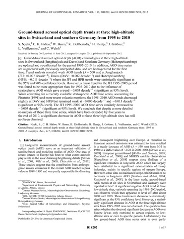 Nyeki, S., Halios, C. orcid id iconORCID: https://orcid.org/0000-0001-8301-8449, Baum, W., Eleftheriadis, K., Flentje, H., Gröbner, J., Vuilleumier, L. and Wehrli, C. (2012) Ground-based aerosol optical depth trends at three high-altitude sites in Switzerland and Southern Germany from 1995–2010. Journal of Geophysical Research, 117. D18202. ISSN 0148-0227 doi: 10.1029/2012JD017493