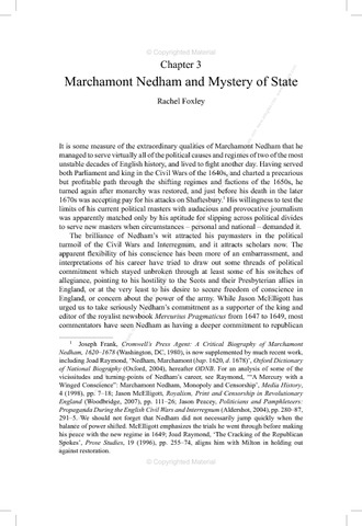 Foxley, R. (2013) Marchamont Nedham and mystery of state. In: Mahlberg, G. and Wiemann, D. (eds.) European contexts for English republicanism. Politics and Culture in Europe, 1650–1750. Ashgate, Farnham, pp. 49-62. ISBN 9781409455561