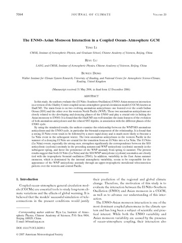 The ENSO-Asian monsoon interaction in a coupled ocean-atmosphere GCM.