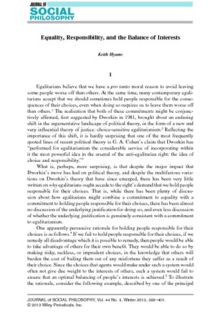 Hyams, K. (2013) Equality, responsibility, and the balance of interests. Journal of Social Philosophy, 44 (4). pp. 392-401. ISSN 1467-9833 doi: 10.1111/josp.12038 (special issue: Egalitarian Justice)