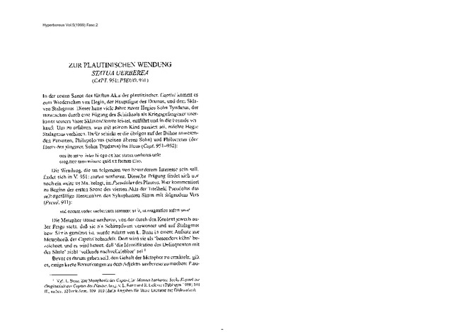Kruschwitz, P. (1999) Zur plautinischen Wendung 'statua verberea' (Capt. 951; Pseud. 911). Hyperboreus. Studia Classica, 5 (2). pp. 350-353. ISSN 0949-2615