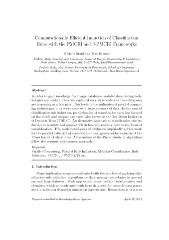 Stahl, F. orcid id iconORCID: https://orcid.org/0000-0002-4860-0203 and Bramer, M. (2012) Computationally efficient induction of classification rules with the PMCRI and J-PMCRI frameworks. Knowledge-Based Systems, 35. pp. 49-63. ISSN 0950-7051 doi: 10.1016/j.knosys.2012.04.014