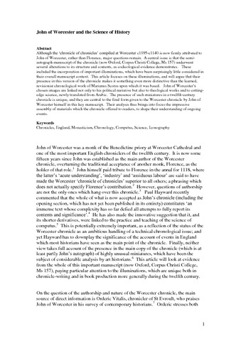 Although the ‘chronicle of chronicles’ compiled at Worcester c1095-c1140 is now firmly attributed to John of Worcester, rather than Florence, major questions remain. A central issue is that the semi-autograph manuscript of the chronicle (now Oxford, Corpus Christi College, Ms 157) underwent several alterations to its structure and contents, as codicological evidence demonstrates. These included the incorporation of important illuminations, which have been surprisingly little considered in their overall manuscript context. This article focuses on these illuminations, and will argue that their presence in this version of the chronicle makes it something even more distinctive than the learned, revisionist chronological work of Marianus Scotus upon which it was based. John of Worcester’s chosen images are linked not only to his political narrative but also to theological works and to cutting-edge science, newly translated from Arabic. The presence of such miniatures in a twelfth-century chronicle is unique, and they are central to the final form given to the Worcester chronicle by John of Worcester himself in this key manuscript. Their analysis thus brings into focus the impressive assembly of materials which the chronicle offered to readers, to shape their understanding of ongoing events.