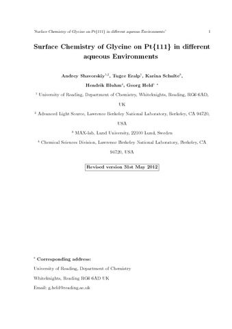 Shavorskiy, A., Eralp, T., Schulte, K., Bluhm, H. and Held, G. (2013) Surface chemistry of glycine on Pt{111} in different aqueous environments. Surface Science, 607. pp. 10-19. ISSN 0039-6028 doi: 10.1016/j.susc.2012.08.015