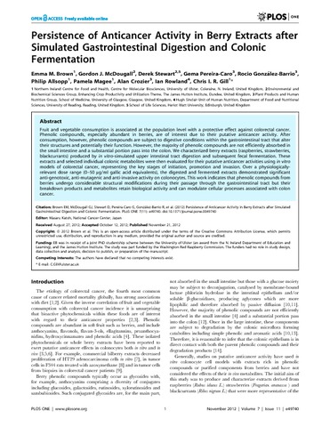 Brown, E. M., McDougall, G. J., Stewart, D., Pereira-Caro, G., González-Barrio, R., Allsopp, P., Magee, P., Crozier, A., Rowland, I. and Gill, C. I. R. (2012) Persistence of anticancer activity in berry extracts after simulated gastrointestinal digestion and colonic fermentation. PLoS ONE, 7 (11). e49740. ISSN 1932-6203 doi: 10.1371/journal.pone.0049740