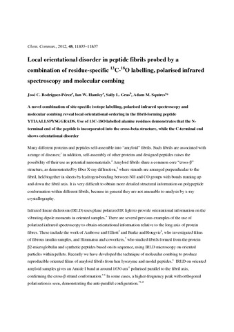 A novel combination of site-specific isotope labelling, polarised infrared spectroscopy and molecular combing reveal local orientational ordering in the fibril-forming peptide YTIAALLSPYSGGRADS. Use of 13C-18O labelled alanine residues demonstrates that the Nterminal end of the peptide is incorporated into the cross-beta structure, while the C-terminal end shows orientational disorder