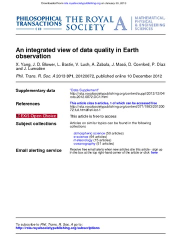 Yang, X., Blower, J.D., Bastin, L., Lush, V., Zabala, A., Maso, J., Cornford, D., Diaz, P. and Lumsden, J. (2012) An integrated view of data quality in Earth observation. Philosophical Transactions of the Royal Society A: Mathematical, Physical and Engineering Sciences, 371 (1983). 20120072. ISSN 1364-503X doi: 10.1098/rsta.2012.0072 (Special Issue S1)