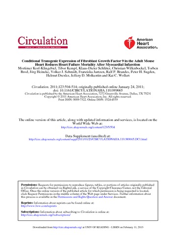 Korf-Klingebiel, M., Kempf, T., Schlüter, K.-D., Willenbockel, C., Brod, T., Heineke, J., Schmidt, V. J., Jantzen, F., Brandes, R. P., Sugden, P. H., Drexler, H., Molkentin, J. D. and Wollert, K. C. (2011) Conditional transgenic expression of fibroblast growth factor 9 in the adult mouse heart reduces heart failure mortality after myocardial infarction. Circulation, 123 (5). pp. 504-14. ISSN 1524-4539 doi: 10.1161/CIRCULATIONAHA.110.989665