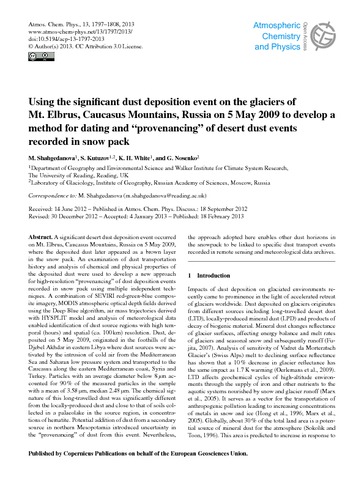 Shahgedanova, M. orcid id iconORCID: https://orcid.org/0000-0002-2320-3885, Kutuzov, S., White, K. H. and Nosenko, G. (2013) Using the significant dust deposition event on the glaciers of Mt. Elbrus, Caucasus Mountains, Russia on 5 May 2009 to develop a method for dating and "provenancing" of desert dust events recorded in snow pack. Atmospheric Chemistry and Physics, 13. pp. 1797-1808. ISSN 1680-7316 doi: 10.5194/acp-13-1797-2013