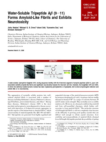 Naskar, J., Drew, M., Deb, I., Das, S. and Banerjee, A. (2008) Water-soluble tripeptide Aβ (9−11) forms amyloid-Like fibrils and exhibits neurotoxicity. Organic Letters, 10 (13). pp. 2625-2628. ISSN 1523-7060 doi: 10.1021/ol8007217