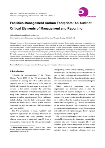 Elmualim, A. and Kwawu, W. (2012) Facilities management carbon footprints: an audit of critical elements of management and reporting. Journal of Civil Engineering and Architecture, 6 (8). pp. 944-952. ISSN 1934-7359