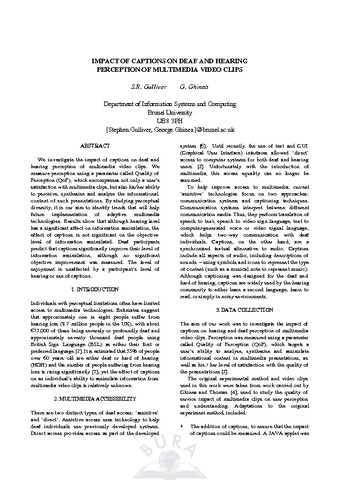 We investigate the impact of captions on deaf and hearing perception of multimedia video clips. We measure perception using a parameter called Quality of Perception (QoP), which encompasses not only a user's satisfaction with multimedia clips, but also his/her ability to perceive, synthesise and analyse the informational content of such presentations. By studying perceptual diversity, it is our aim to identify trends that will help future implementation of adaptive multimedia technologies. Results show that although hearing level has a significant affect on information assimilation, the effect of captions is not significant on the objective level of information assimilated. Deaf participants predict that captions significantly improve their level of information assimilation, although no significant objective improvement was measured. The level of enjoyment is unaffected by a participant’s level of hearing or use of captions.