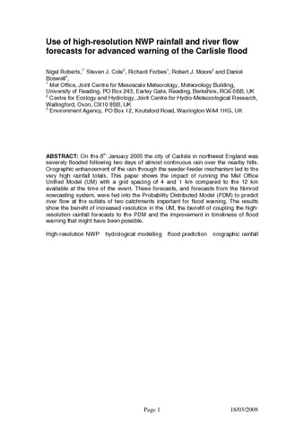 Roberts, N. M., Cole, S. J., Forbes, R. M., Moore, R. J. and Boswell, D. (2008) Use of high-resolution NWP rainfall and river flow forecasts for advance warning of the Carlisle flood, north-west England. Meteorological Applications, 16 (1). pp. 23-34. ISSN 1469-8080 doi: 10.1002/met.94
