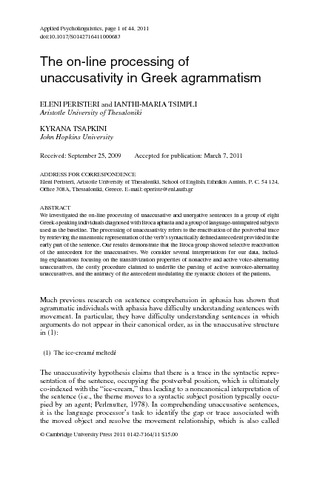 Peristeri, E., Tsimpli, I.-M. and Tsapkini, K. (2013) The on-line processing of unaccusativity in Greek agrammatism. Applied Psycholinguistics, 34 (2). pp. 233-276. ISSN 1469-1817 doi: 10.1017/S0142716411000683