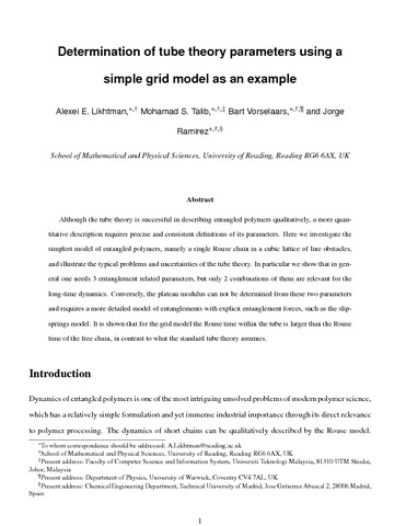 Likhtman, A., Talib, M., Vorselaars, B. and Ramirez, J. (2013) Determination of tube theory parameters using a simple grid model as an example. Macromolecules, 46 (3). pp. 1187-1200. ISSN 0024-9297 doi: 10.1021/ma302103p