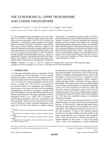 Gettelman, A., Hoor, P., Pan, L. L., Randel, W. J., Hegglin, M. I. orcid id iconORCID: https://orcid.org/0000-0003-2820-9044 and Birner, T. (2011) The extratropical upper troposphere and lower stratosphere. Reviews of Geophysics, 49 (3). RG3003. ISSN 8755-1209 doi: 10.1029/2011RG000355