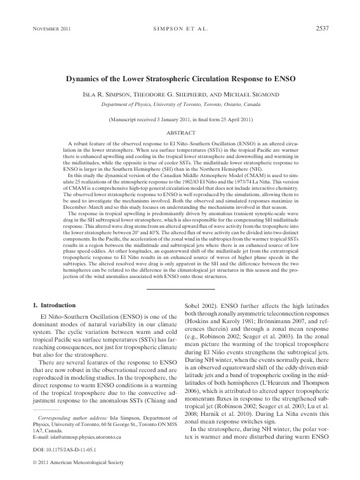 Dynamics of the lower stratospheric circulation response to ENSO.
