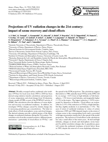 Bais, A. F., Tourpali, K., Kazantzidis, A., Akiyoshi, H., Bekki, S., Braesicke, P., Chipperfield, M. P., Dameris, M., Eyring, V., Garny, H., Jachetti, D., J¨ockel, P., Kubin, A., Langematz, U., Mancini, E., Michou, M., Morgenstern, O., Nakamura, T., Newman, P. A., Pitari, G., Plummer, D. A., Rozanov, E., Shepherd, T. G. orcid id iconORCID: https://orcid.org/0000-0002-6631-9968, Shibata, K., Tian, W. and Yamashita, Y. (2011) Projections of UV radiation changes in the 21st century: impact of ozone recovery and cloud effects. Atmospheric Chemistry and Physics, 11 (15). pp. 7533-7545. ISSN 1680-7316 doi: 10.5194/acp-11-7533-2011