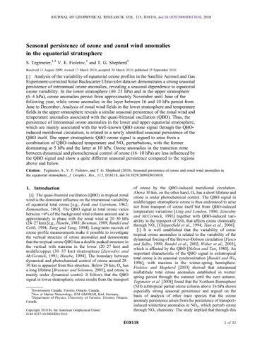 Tegtmeier, S., Fioletov, V. E. and Shepherd, T. G. orcid id iconORCID: https://orcid.org/0000-0002-6631-9968 (2010) Seasonal persistence of ozone and zonal wind anomalies in the equatorial stratosphere. Journal of Geophysical Research, 115. D18118. ISSN 0148-0227 doi: 10.1029/2009JD013010