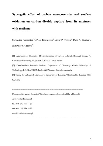 Furmaniak, S., Kowalczyk, P., Terzyk, A. P., Gauden, P. A. and Harris, P. J. F. (2013) Synergetic effect of carbon nanopore size and surface oxidation on CO2 capture from CO2/CH4 mixtures. Journal of Colloid and Interface Science, 397. pp. 144-153. ISSN 0021-9797 doi: 10.1016/j.jcis.2013.01.044