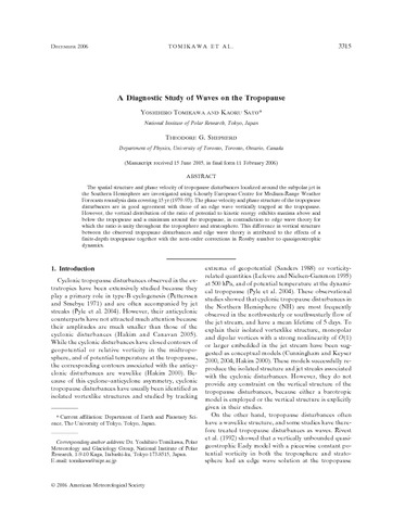 Tomikawa, Y., Sato, K. and Shepherd, T. G. orcid id iconORCID: https://orcid.org/0000-0002-6631-9968 (2006) A diagnostic study of waves on the tropopause. Journal of the Atmospheric Sciences, 63 (12). pp. 3315-3332. ISSN 1520-0469 doi: 10.1175/JAS3800.1