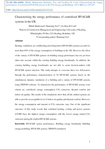 Heating, ventilation, air conditioning and refrigeration (HVAC&R) systems account for more than 60% of the energy consumption of buildings in the UK. However, the effect of the variety of HVAC&R systems on building energy performance has not yet been taken into account within the existing building energy benchmarks. In addition, the existing building energy benchmarks are not able to assist decision-makers with HVAC&R system selection. This study attempts to overcome these two deficiencies through the performance characterisation of 36 HVAC&R systems based on the simultaneous dynamic simulation of a building and a variety of HVAC&R systems using TRNSYS software. To characterise the performance of HVAC&R systems, four criteria are considered; energy consumption, CO2 emissions, thermal comfort and indoor air quality. The results of the simulations show that, all the studied systems are able to provide an acceptable level of indoor air quality and thermal comfort. However, the energy consumption and amount of CO2 emissions vary. One of the significant outcomes of this study reveals that combined heating, cooling and power systems (CCHP) have the highest energy consumption with the lowest energy related CO2 emissions among the studied HVAC&R systems.
