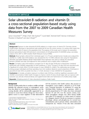 Greenfield, J. A., Park, P. S., Farahani, E., Malik, S., Vieth, R., McFarlane, N. A., Shepherd, T. G. orcid id iconORCID: https://orcid.org/0000-0002-6631-9968 and Knight, J. A. (2012) Solar ultraviolet-B radiation and vitamin D: a cross-sectional population-based study using data from the 2007 to 2009 Canadian Health Measures Survey. BMC Public Health, 12 (660). ISSN 1471-2458 doi: 10.1186/1471-2458-12-660