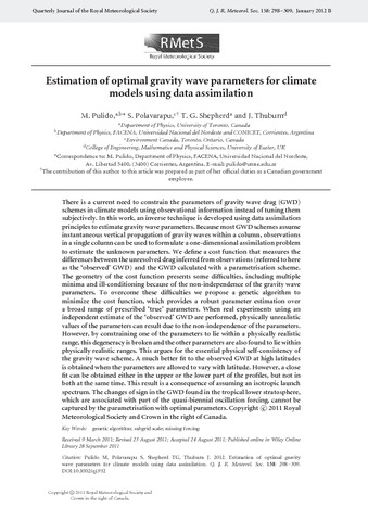 Pulido, M., Polavarapu, S., Shepherd, T.G. orcid id iconORCID: https://orcid.org/0000-0002-6631-9968 and Thuburn, J. (2012) Estimation of optimal gravity wave parameters for climate models using data assimilation. Quarterly Journal of the Royal Meteorological Society, 138 (663). pp. 298-309. ISSN 1477-870X doi: 10.1002/qj.932 (Part B)