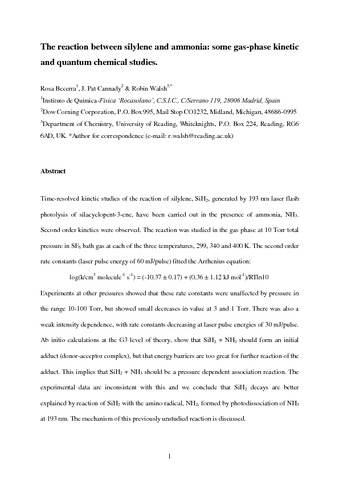 Becerra, R., Cannady, J. P. and Walsh, R. (2007) The reaction between silylene and ammonia: some gas-phase kinetic and quantum chemical studies. Silicon Chemistry, 3 (3-4). pp. 131-138. ISSN 1572-8994 doi: 10.1007/s11201-006-9018-3