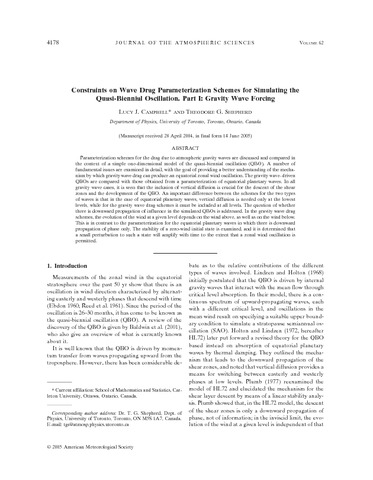 Parameterization schemes for the drag due to atmospheric gravity waves are discussed and compared in the context of a simple one-dimensional model of the quasi-biennial oscillation (QBO). A number of fundamental issues are examined in detail, with the goal of providing a better understanding of the mechanism by which gravity wave drag can produce an equatorial zonal wind oscillation. The gravity wave–driven QBOs are compared with those obtained from a parameterization of equatorial planetary waves. In all gravity wave cases, it is seen that the inclusion of vertical diffusion is crucial for the descent of the shear zones and the development of the QBO. An important difference between the schemes for the two types of waves is that in the case of equatorial planetary waves, vertical diffusion is needed only at the lowest levels, while for the gravity wave drag schemes it must be included at all levels. The question of whether there is downward propagation of influence in the simulated QBOs is addressed. In the gravity wave drag schemes, the evolution of the wind at a given level depends on the wind above, as well as on the wind below. This is in contrast to the parameterization for the equatorial planetary waves in which there is downward propagation of phase only. The stability of a zero-wind initial state is examined, and it is determined that a small perturbation to such a state will amplify with time to the extent that a zonal wind oscillation is permitted.