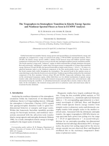 Global horizontal wavenumber kinetic energy spectra and spectral fluxes of rotational kinetic energy and enstrophy are computed for a range of vertical levels using a T799 ECMWF operational analysis. Above 250 hPa, the kinetic energy spectra exhibit a distinct break between steep and shallow spectral ranges, reminiscent of dual power-law spectra seen in aircraft data and high-resolution general circulation models. The break separates a large-scale ‘‘balanced’’ regime in which rotational flow strongly dominates divergent flow and a mesoscale ‘‘unbalanced’’ regime where divergent energy is comparable to or larger than rotational energy. Between 230 and 100 hPa, the spectral break shifts to larger scales (from n 5 60 to n 5 20, where n is spherical harmonic index) as the balanced component of the flow preferentially decays. The location of the break remains fairly stable throughout the stratosphere. The spectral break in the analysis occurs at somewhat larger scales than the break seen in aircraft data. Nonlinear spectral fluxes defined for the rotational component of the flow maximize between about 300 and 200 hPa. Large-scale turbulence thus centers on the extratropical tropopause region, within which there are two distinct mechanisms of upscale energy transfer: eddy–eddy interactions sourcing the transient energy peak in synoptic scales, and zonal mean–eddy interactions forcing the zonal flow. A well-defined downscale enstrophy flux is clearly evident at these altitudes. In the stratosphere, the transient energy peak moves to planetary scales and zonal mean–eddy interactions become dominant.