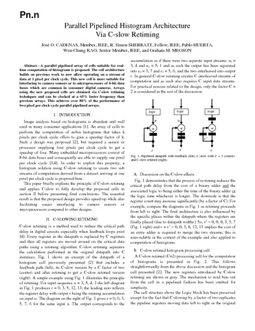 A parallel pipelined array of cells suitable for realtime computation of histograms is proposed. The cell architecture builds on previous work to now allow operating on a stream of data at 1 pixel per clock cycle. This new cell is more suitable for interfacing to camera sensors or to microprocessors of 8-bit data buses which are common in consumer digital cameras. Arrays using the new proposed cells are obtained via C-slow retiming techniques and can be clocked at a 65% faster frequency than previous arrays. This achieves over 80% of the performance of two-pixel per clock cycle parallel pipelined arrays.