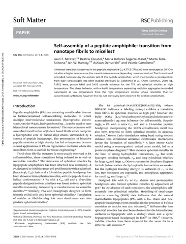 Miravet, J. F., Escuder, B., Segarra-Maset, M. D., Tena-Solsona, M., Hamley, I. W. orcid id iconORCID: https://orcid.org/0000-0002-4549-0926, Dehsorkhi, A. and Castelletto, V. (2013) Self-assembly of a peptide amphiphile: transition from nanotape fibrils to micelles. Soft Matter, 9 (13). pp. 3558-3564. ISSN 1744-683X doi: 10.1039/c3sm27899a