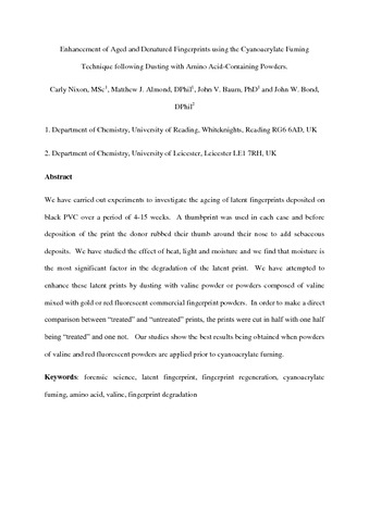 Nixon, C., Almond, M. J., Baum, J. V. and Bond, J. W. (2013) Enhancement of aged and denatured fingerprints using the cyanoacrylate fuming technique following dusting with amino acid-containing powders. Journal of Forensic Sciences, 58 (2). pp. 508-512. ISSN 0022-1198 doi: 10.1111/1556-4029.12052