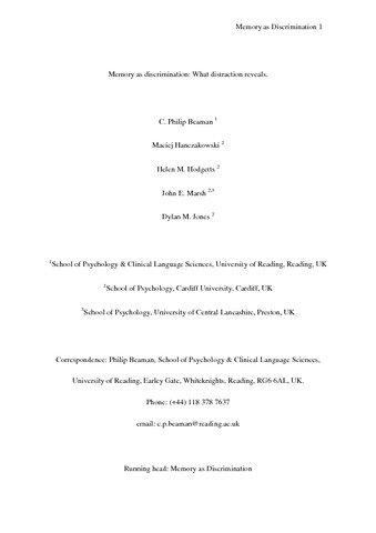Beaman, C. P. orcid id iconORCID: https://orcid.org/0000-0001-5124-242X, Hanczakowski, M., Hodgetts, H., Marsh, J. and Jones, D. (2013) Memory as discrimination: what distraction reveals. Memory & Cognition, 41 (8). pp. 1238-1251. ISSN 1532-5946 doi: 10.3758/s13421-013-0327-4